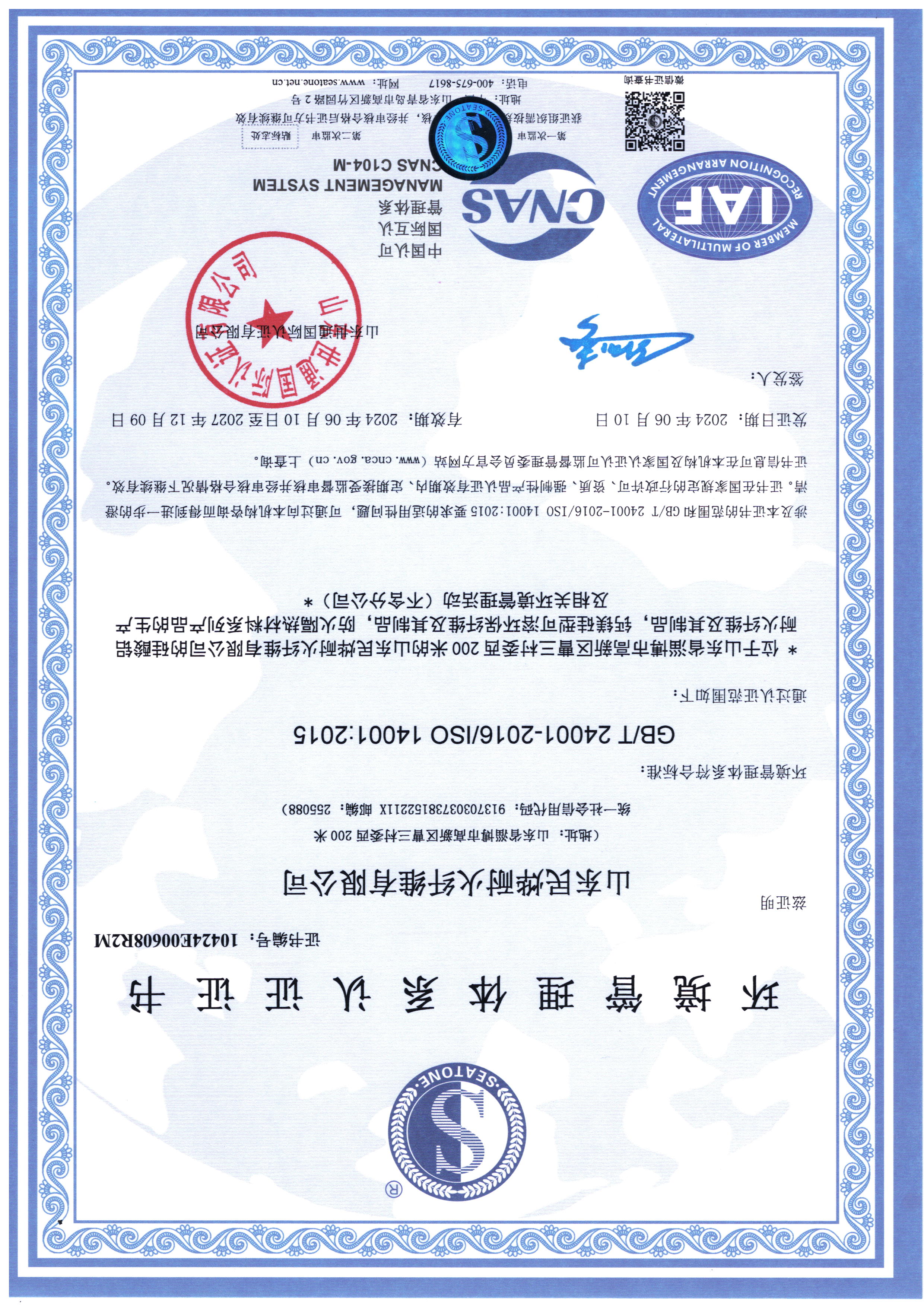 • 2024年環(huán)境體系認(rèn)證證書(shū)